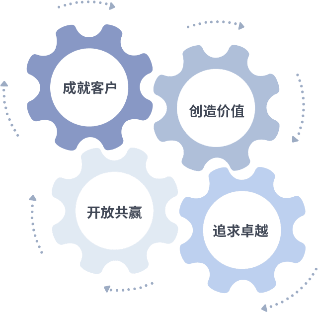 成就客户是一切决策的出发点,,创造价值是衡量所有工作的标准,,追求卓越是我们做事做人的态度,,开放共赢是我们的格局也是最终的结果。。。价值观的齿轮环环相扣,,,推动着组织里的每个人不断向前。。。。